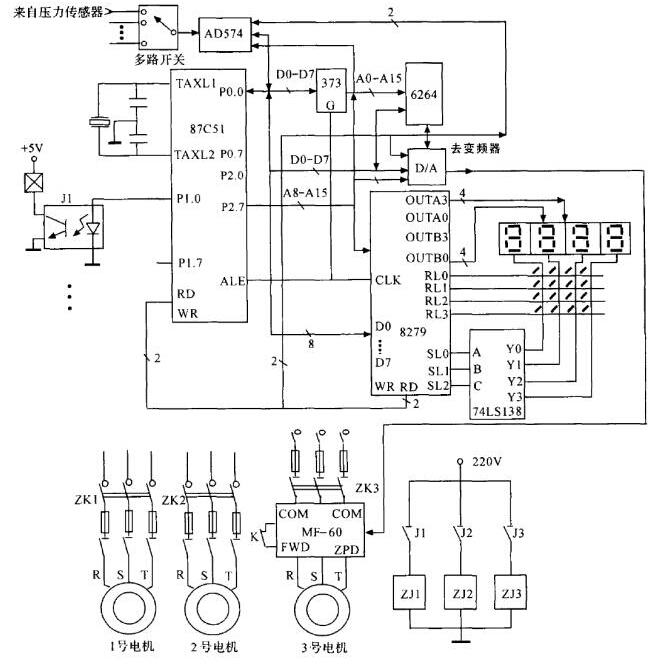 控制器主要實現(xiàn)對送風(fēng)量的控制,使送風(fēng)壓力保持基本恒定。這里用單片機及其外圍電路構(gòu)成,如圖4所示。用數(shù)碼管顯示送風(fēng)壓力,壓力的給定可以用鍵盤輸入也可以用電位器經(jīng)A/ D轉(zhuǎn)換后輸入。控制器在功能上,既能實現(xiàn)連續(xù)控制,也能實現(xiàn)分級不連續(xù)控制,具體通過程序編制實現(xiàn)。