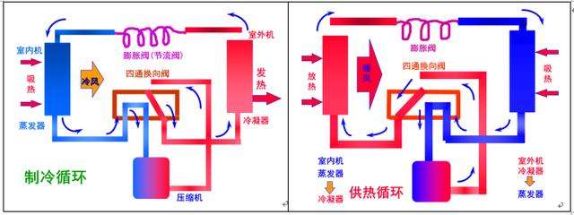空調(diào)“制熱模式”則是相反的過程,壓縮機內(nèi)氣態(tài)的制冷劑進入的是室內(nèi)的交換器,變成液體,放出熱量。而空調(diào)之所以可以源源不斷地輸送“暖氣”或“冷氣”,是因為液態(tài)的制冷劑繼續(xù)通過管道流向室外的交換器,變成氣體,再進入室內(nèi),形成一個循環(huán)。